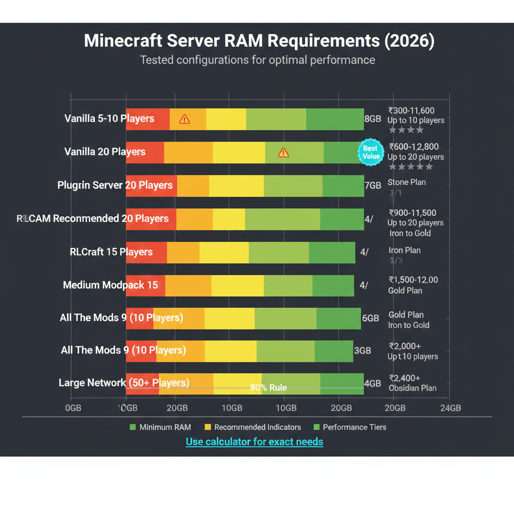- Modded servers: Minimum 6GB, typically 8-16GB (₹900-₹2,400/month)