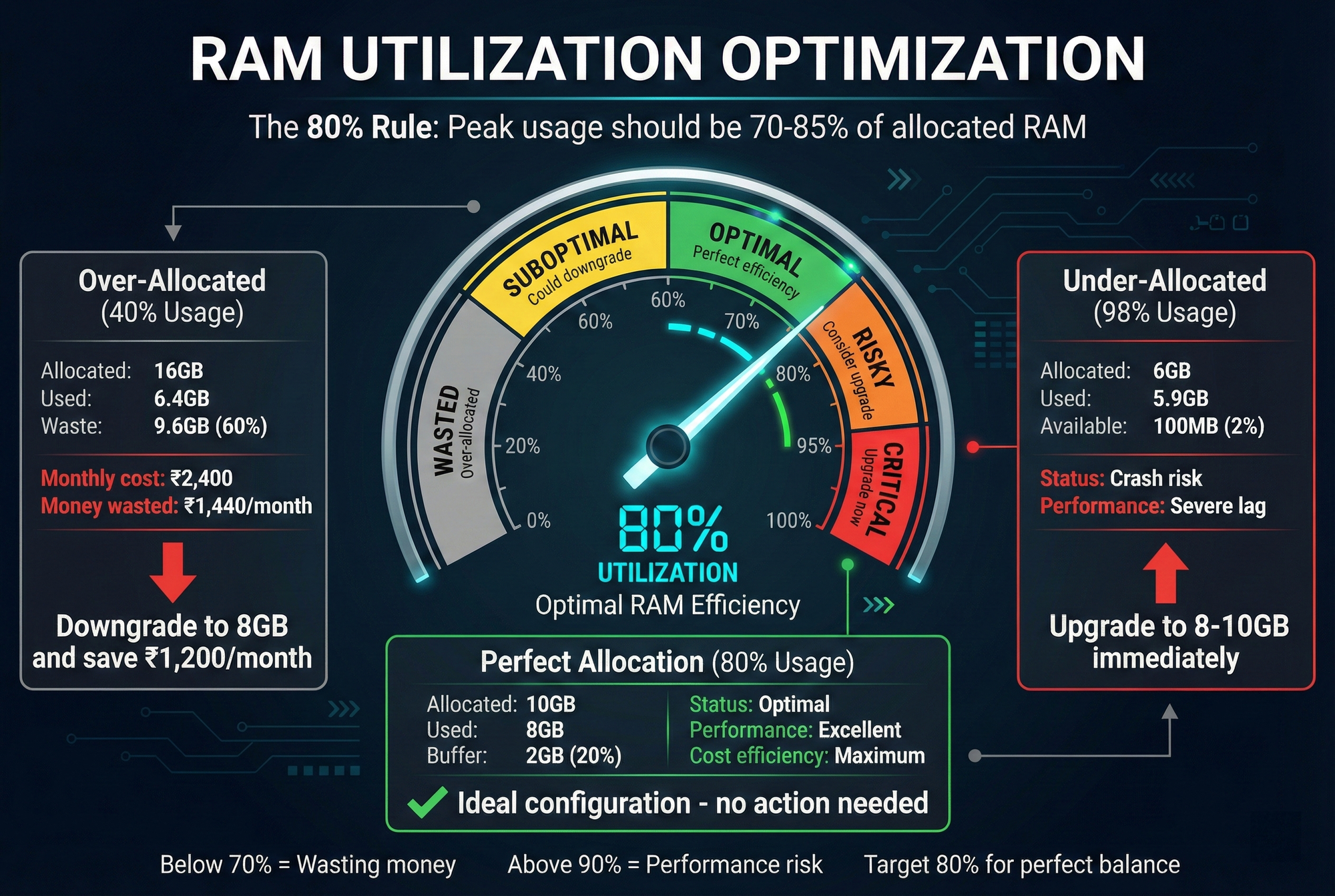 - Target 70-85% RAM utilization at peak load