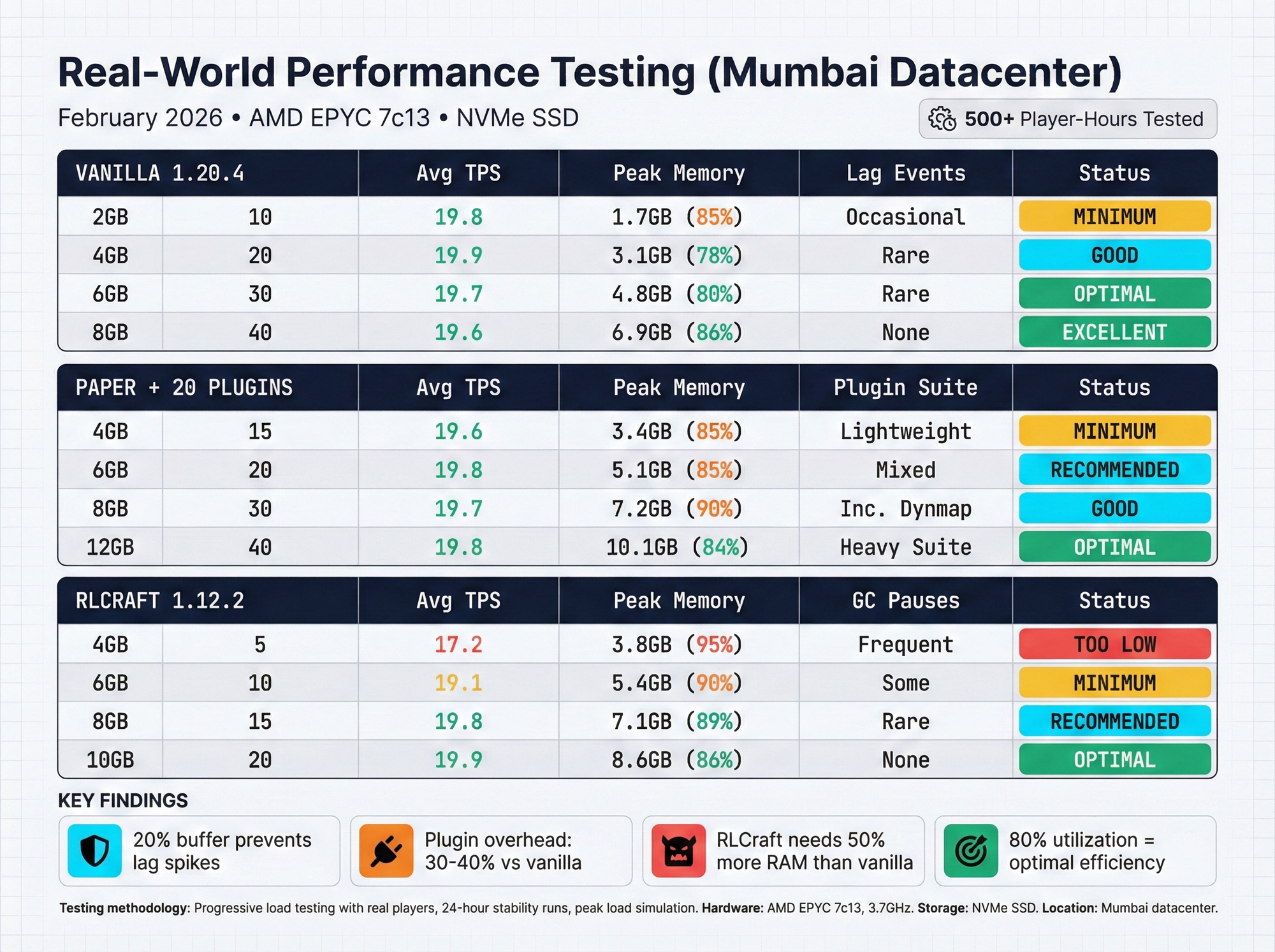 Testing Data: Real-world load testing with 500+ player-hours across all configurations