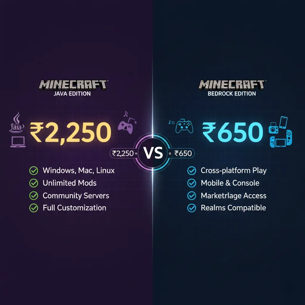 Java Edition (₹2,250) runs on PC only but supports unlimited mods, plugins, and custom servers. Bedrock Edition (₹650+) runs on Windows, Mobile, and consoles with cross-platform play but has limited mod support. Java is preferred for serious modding; Bedrock is better for playing with friends on different devices.