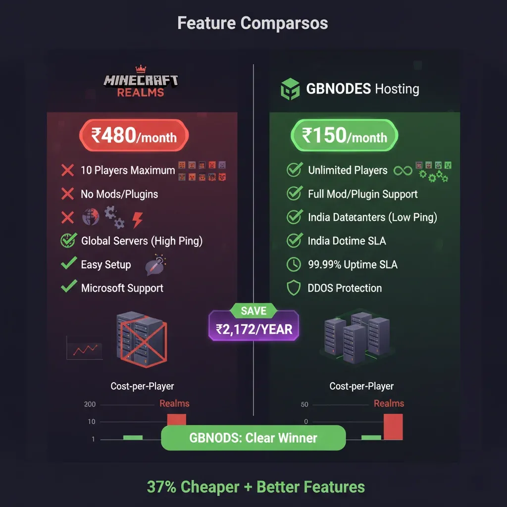 Yes. GBNODES starts at ₹150/month (vs Realms ₹480/month), offers unlimited players (vs 10 max), full mod/plugin support (vs none), and India-based servers (vs global). For the same 10-player capacity, GBNODES 2GB plan (₹299/month) saves you ₹181/month (₹2,172/year) compared to Realms.